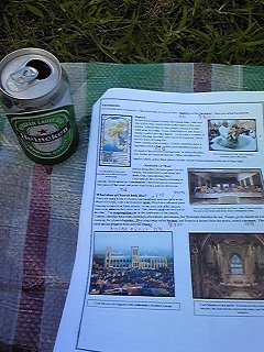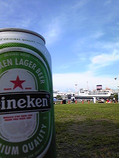 たはは! 向こうの海に浮かぶ氷川丸を眺めながら、レジャーシートの上に座って飲むハイネケン、最高!!